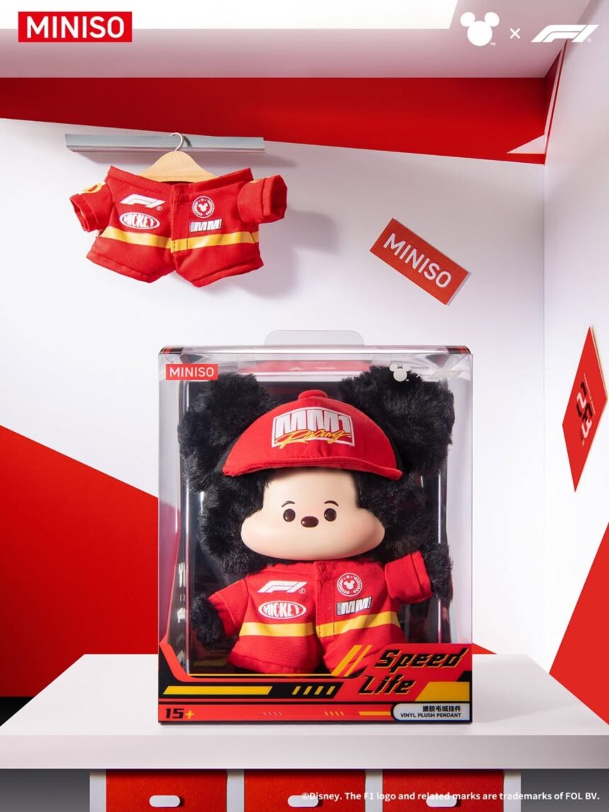 MINISO is also part of the action, with a 30-plus piece collectible capsule hitting at the same time. The lineup includes blind-box vinyl figures, racing-suited plush, statement caps, patterned socks, drinkware, tech accessories, and blankets. The collection leans into bold red-and-black palettes, helmet iconography, and checkered details.