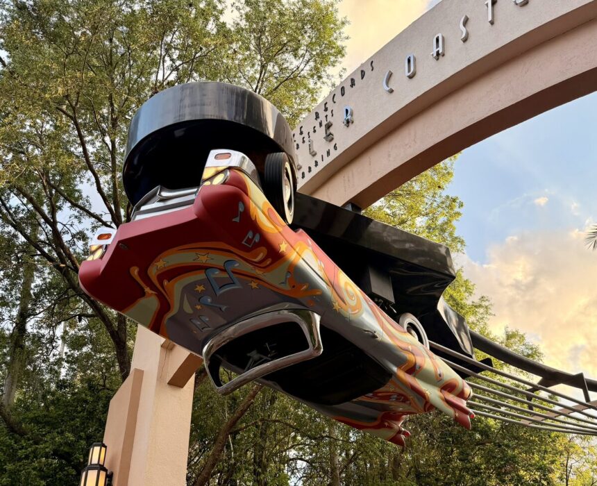 The iconic upside-down convertible outside Rock ‘n’ Roller Coaster at Disney’s Hollywood Studios is getting a fresh new look ahead of the attraction’s Muppets retheme. New photos show the car sporting a wild psychedelic paint job featuring swirling graphics, stars, and musical notes, giving fans a preview of the Electric Mayhem’s takeover.